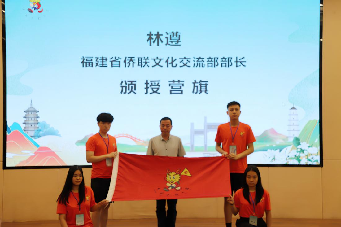 林遵代表省、市侨联上台向营员代表颁授营旗,拉开2024年“中国寻根之旅”夏令营福建福州营的序幕。