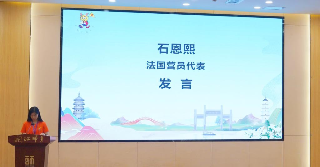法国营员代表石恩熙在发言中表示,非常荣幸能够参加“中国寻根之旅”夏令营福建福州营,希望通过这段旅程,更加深入地了解中华文化,闽都文化,希望将把这次经历转化为学习和生活的动力,为未来的发展打下坚实的基础,让中华文化在我们心中生根发芽、开花结果。