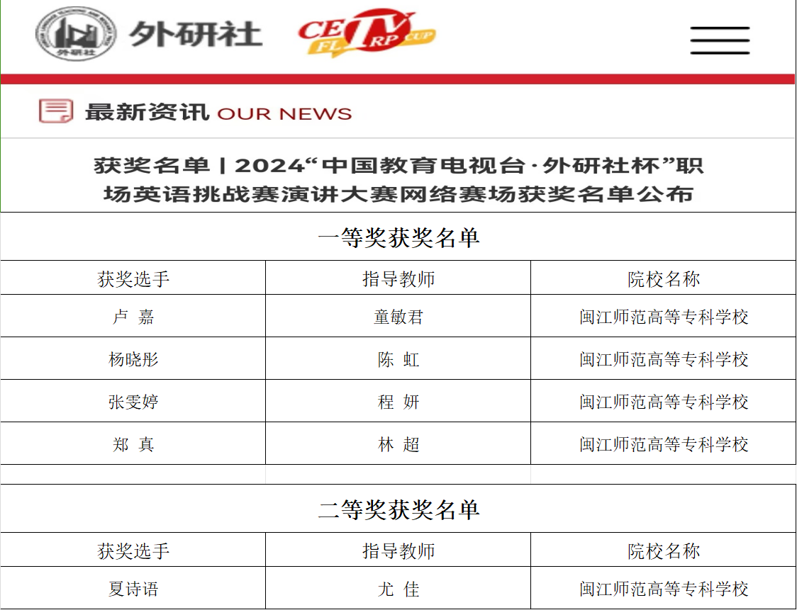 近日,2024“中国教育电视台·外研社杯”职场英语挑战赛演讲大赛网络赛圆满落幕。我校学子获一等奖4项、二等奖1项。