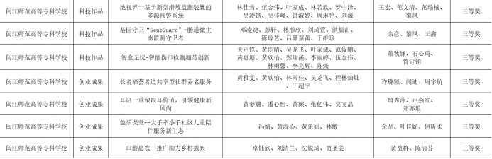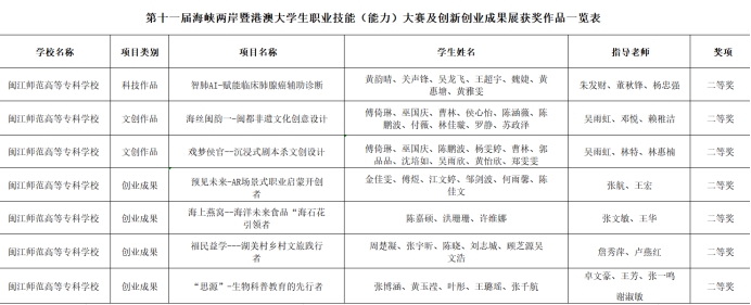 近日,由福建省教育厅、福建省人力资源和社会保障厅、福建省互联网信息办公室、平潭综合实验区管委会联合主办的第十一届海峡两岸暨港澳大学生职业技能(能力)大赛及创新创业成果展在福州英华职业学院落下帷幕。本次大赛共吸引了1019所学校参加,其中高职院校405所,我校选送20个项目作品参加创新创业成果展,经激烈角逐,荣获二等奖7项,三等奖7项。