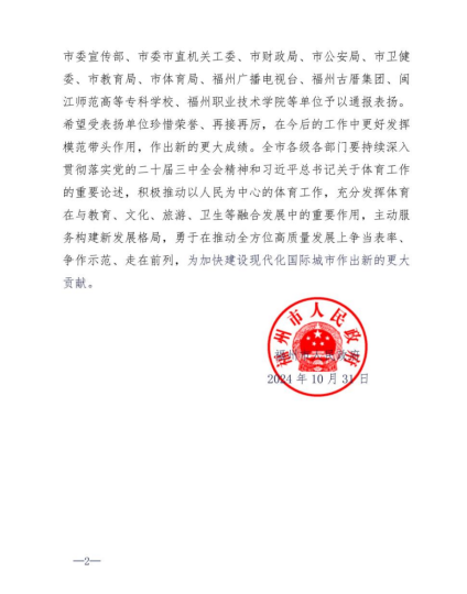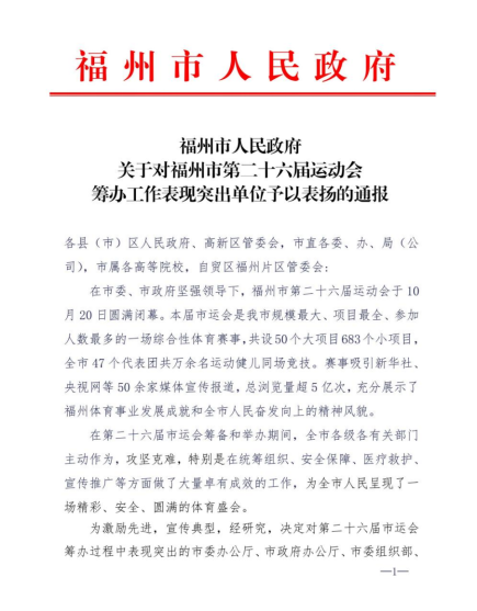 近日,我校收到福州市人民政府表扬信,对我校在福州市第二十六届运动会筹办过程中的突出表现提出表扬。