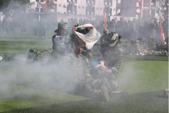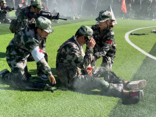 在军训会操表演上,新生们队列整齐、口号响亮,充满朝气和活力,军训学员还结合专业特长,开展了战地救护演练,展示了当代青年的勇毅担当,展现了新时代闽师学子意志坚定、顽强拼搏的优秀品质。