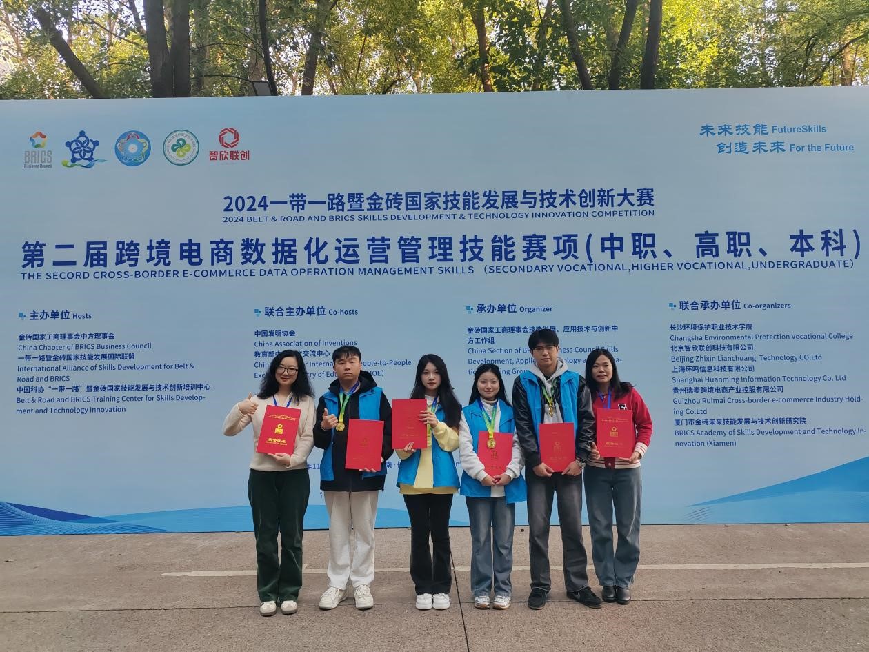 11月30日,2024“一带一路”暨金砖国家技能发展与技术创新大赛第二届跨境电商数据化运营管理技能赛项全国总决赛在湖南省长沙环境保护职业技术学院举办。我校外语商贸学院教师郑堤姑、陈海燕指导的黄穗娜、周睿、吴文浩、吴伟杰4名同学在决赛中凭借扎实的专业知识、熟练的技能操作以及出色的团队协作能力,荣获全国一等奖。郑堤姑、陈海燕获得优秀指导老师奖,我校获得最佳组织奖。