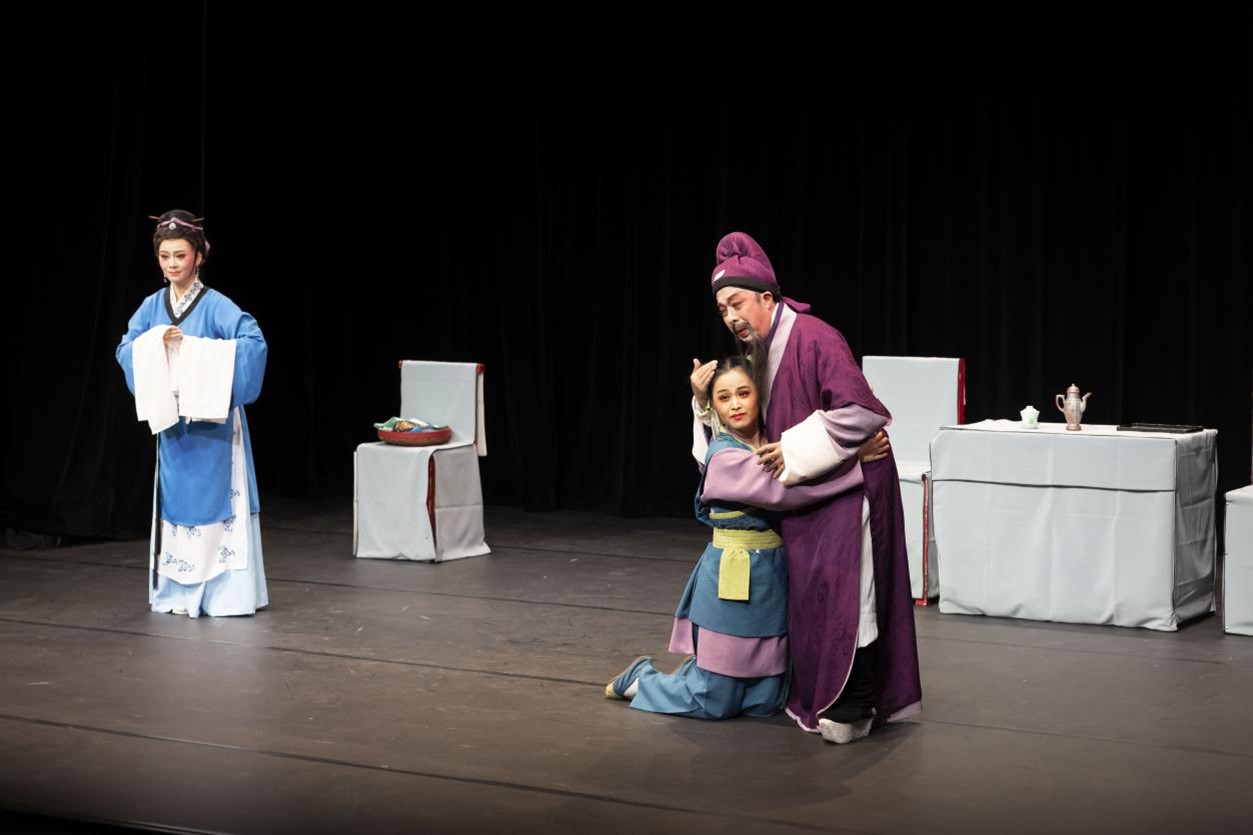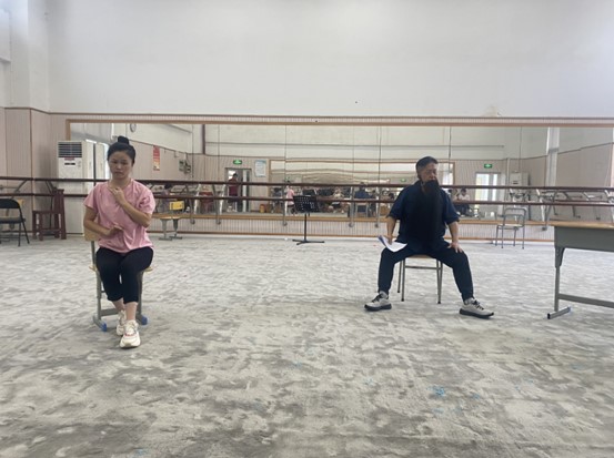 2023年6月,陈乃春(右一)参与赴港交流剧目《珍珠塔》排练