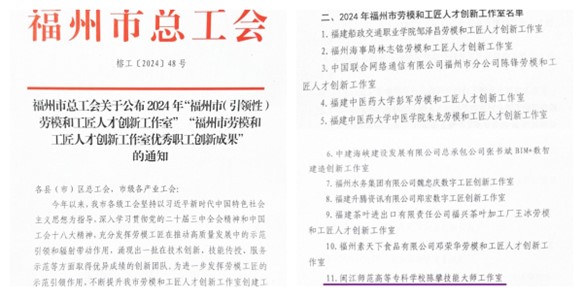 近日,福州市总工会公布了2024年“福州市(引领性)劳模和工匠人才创新工作室”“福州市劳模和工匠人才创新工作室优秀职工创新成果”的通知,我校陈攀技能大师工作室荣获“福州市劳模和工匠人才创新工作室”称号。