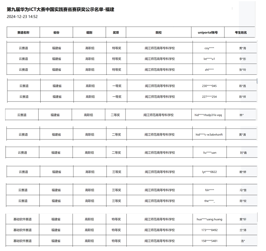 第九届华为ICT大赛中国区福建省实践赛于12月成功举办,我校数字信息工程学院学生积极备赛,并在比赛过程中表现优异,荣获高职组云赛道特等奖3名、一等奖2名、二等奖3名、三等奖4名,高职组基础软件赛道特等奖3名、二等奖1名,三等奖1名。其中大数据技术专业学生黄荣海、李晓彤、张惠玲成功获得代表福建省参加华为ICT大赛2024-2025中国区云赛道决赛的资格,信息安全技术应用专业学生黄子轩、兰建涛、姚浩获得基础软件赛道国赛决赛资格。