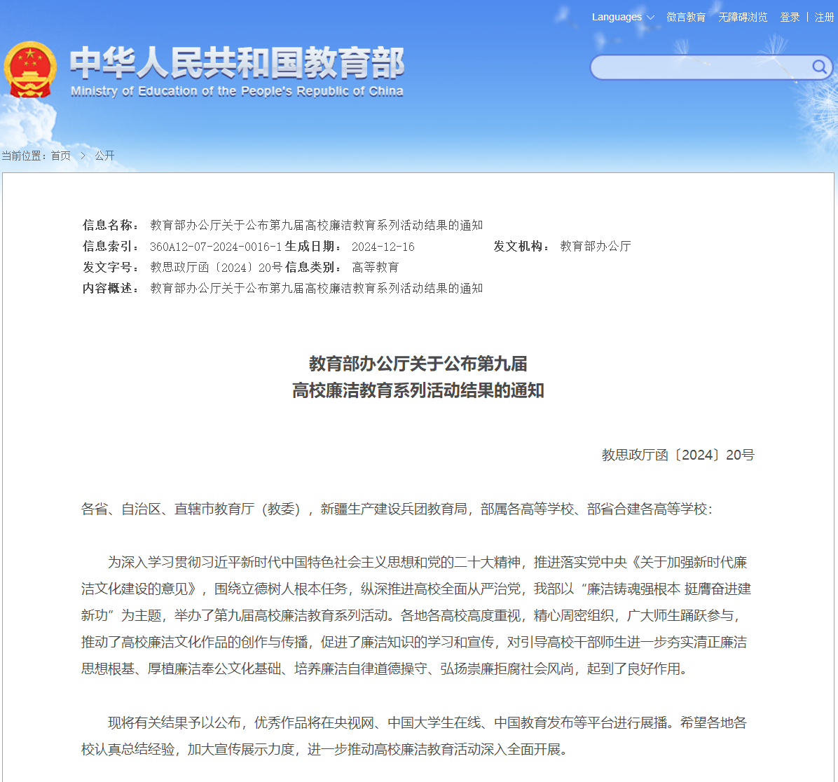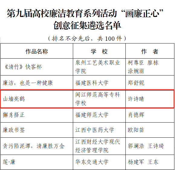 近日,教育部办公厅公布了第九届高校廉洁教育系列活动结果,由我校机关党委推荐的作品《山墙亮鹤》入选“画廉正心”创意征集遴选名单,人文与管理学院23级李淑琳同学荣获知识问答优秀学员。我校选送的作品连续两年入选教育部高校廉洁教育系列活动优秀作品。