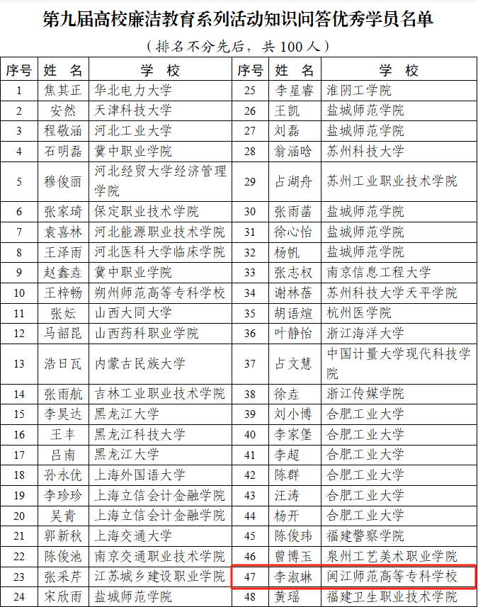 校纪委高度重视此次廉洁教育系列活动,组织9695名师生在线参加廉洁知识问答和廉洁故事答题,征集系列廉洁文创作品158件。同时,精心组织开展“廉洁福建 清清校园”系列活动,廉洁主题闽剧《守正如兰》、民乐重奏《醉太平》2个节目精彩亮相福建省2024年廉洁文化周之“廉洁福建 清清校园”主题晚会演出,“清风润校园 廉韵沁我心”廉洁文化艺术作品展受到新福建、福建法治报、清风福州、福州电视台等媒体刊播,社会反响良好。