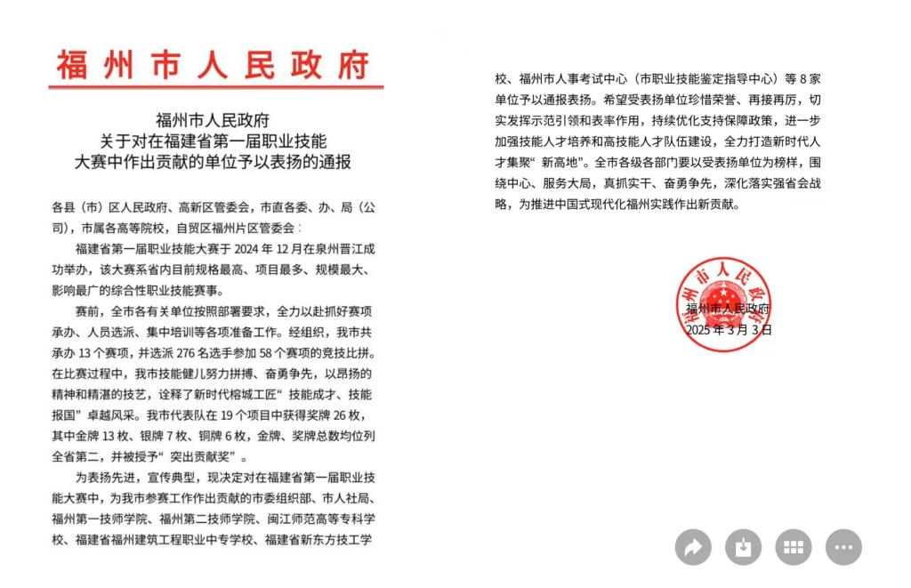 近日,福州市人民政府发布《关于对在福建省第一届职业技能大赛中作出贡献的单位予以表扬的通报》,我校因出色承办"3D数字游戏艺术"与"虚拟现实工程技术"两大赛项,被授予"突出贡献奖"。这是我校继成功举办赛事后,再次获得政府层面的高度肯定。