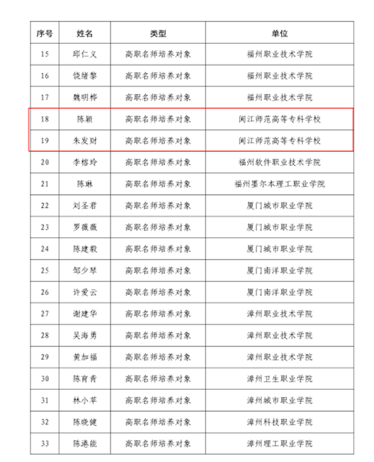 近日,福建省教育厅公布了福建省新时代职业教育名师(名匠)名校长培养计划(2024-2025)培养对象名单,我校陈颖、朱发财两名教师入选福建省高职名师培养对象。