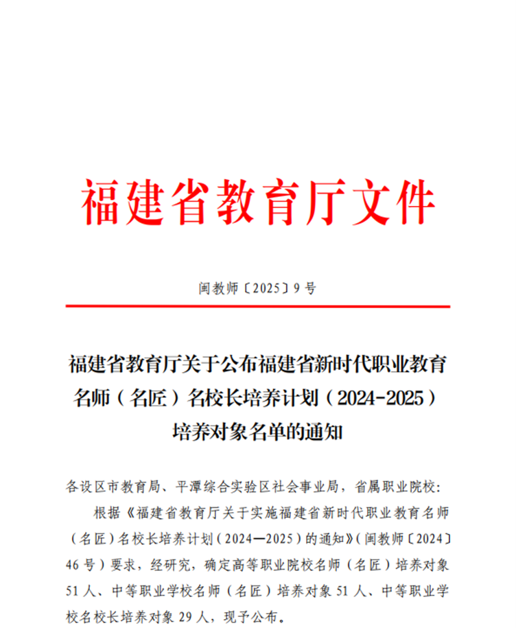 根据《福建省教育厅关于公布福建省新时代职业教育名师(名匠)名校长培养计划(2024-2025)培养对象名单的通知》,我校徐青入选福建省中职名校长培养对象,张林娜入选福建省中职名匠培养对象。