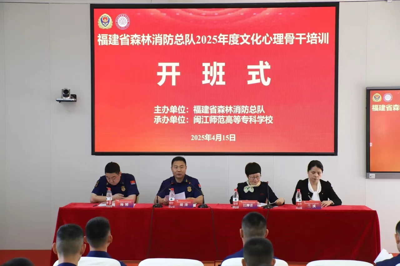 4月13日-4月23日,我校受福建省森林消防总队的委托,开展“福建省森林消防总队2025年度文化心理骨干培训班”。4月15日上午,培训班开班仪式在旗山校区举行,福建省森林消防总队政治部主任胡涛、闽江师范高等专科学校副校长江柳青、闽江师范高等专科学校继续教育学院院长兰浈出席仪式,来自福建、浙江、江西、海南四省的33位消防指战员参加。仪式由福建省森林消防总队教育宣传处副处长杨精主持。
