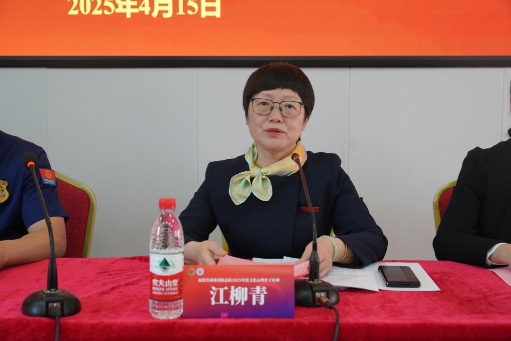 会上,江柳青为培训致辞,详细介绍了学校建设情况,并对参训学员的到来表示热烈欢迎。她指出,本次培训是我校与福建省森林消防总队的第四次合作,邀请了多位高校知名专家和行业精英授课,课程内容丰富,形式灵活多样,通过专业讲座、实践操作以及小组讨论等多种教学形式,涵盖心理调适与危机应对、心理辅导理论与实务、文艺主持与展演、活动组织和策划等多个方面,确保理论与实践紧密结合。