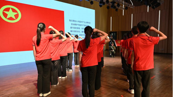 活动中的主题团日活动展示环节将现场气氛推向高潮,来自学校与福州高新区的团员青年共同登台演绎。小繁星公益童声合唱团深情演唱原创歌曲《侯官是我家》,用歌声表达地方文化魅力;两岸青年代表同台演绎《我们同唱一首歌》,用歌声传递两岸同胞一家亲的真挚情感;我校学生越剧社团精彩呈现经典剧目《红楼梦·天上掉下个林妹妹》选段,彰显中华优秀传统文化的独特魅力与时代价值。活动最后,团员重温入团誓词仪式在庄严宣誓中进行,现场全体团员青年齐声高唱《光荣啊,中国共青团》,铿锵誓言与嘹亮歌声交相辉映,充分展现新时代青年的坚定信念与昂扬斗志。