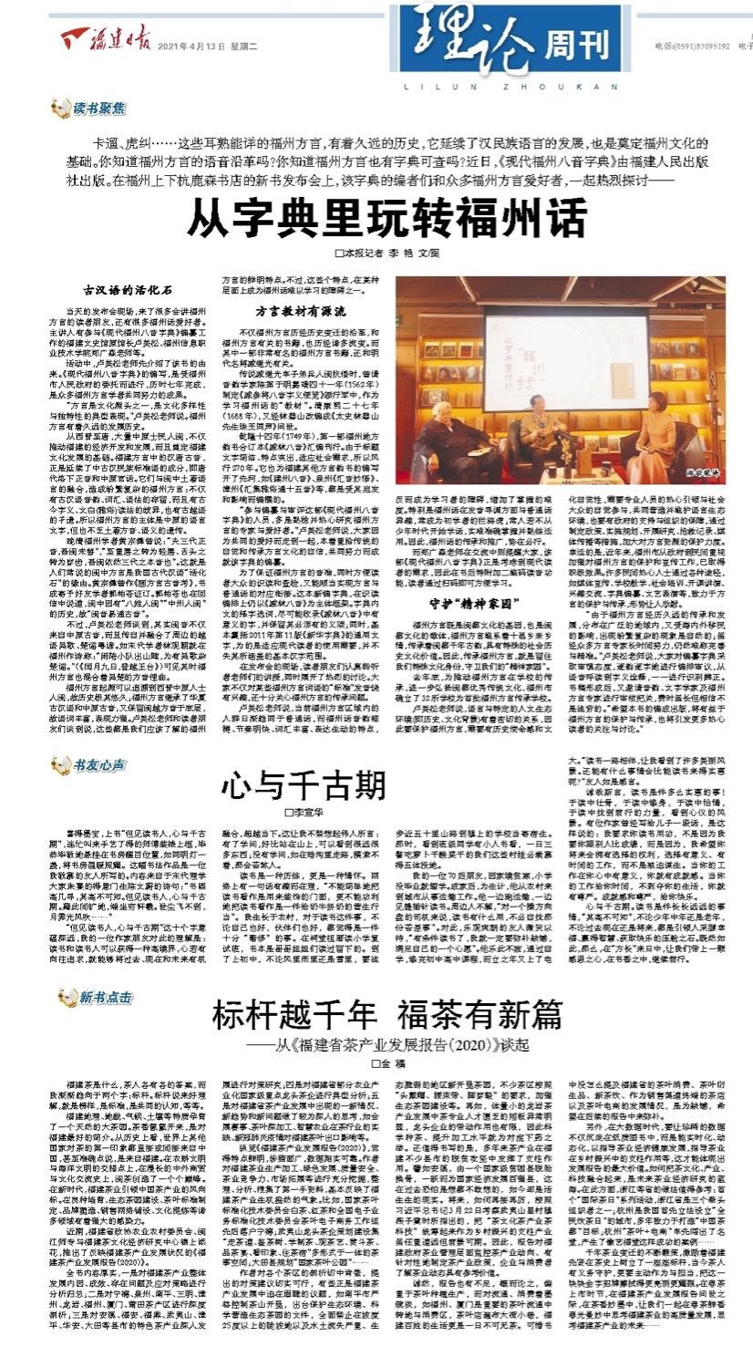 4月13日,《福建日报》专题报道了福建人民出版社金穑的署名文章——《标杆越千年福茶有新篇——从<福建省茶产业发展报告(2020)>谈起》。