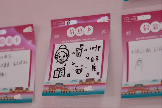 活动伊始,青年们用自画像卡片给自己来个简笔画像,并把手中的承载着对收获幸福的期盼、对美好姻缘的期许的信息卡贴到缘分墙上。