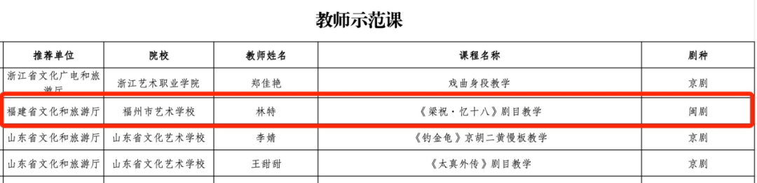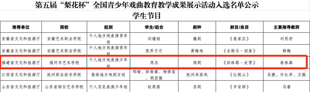 近日,文化和旅游部公布第五届“梨花杯”全国青少年戏曲教育教学成果展示活动入选名单,由福建省文化和旅游厅推荐,我校申报的两个戏曲作品——教师示范课《梁祝·忆十八》剧目教学,以及学生个人展示节目闽剧《珍珠塔·走雪》,凭借卓越的教学水准与精湛的表演技艺,从众多参评作品中脱颖而出,成为福建省唯一入选的学生节目与教师示范课作品,成功亮相这一全国戏曲教育界的盛事。