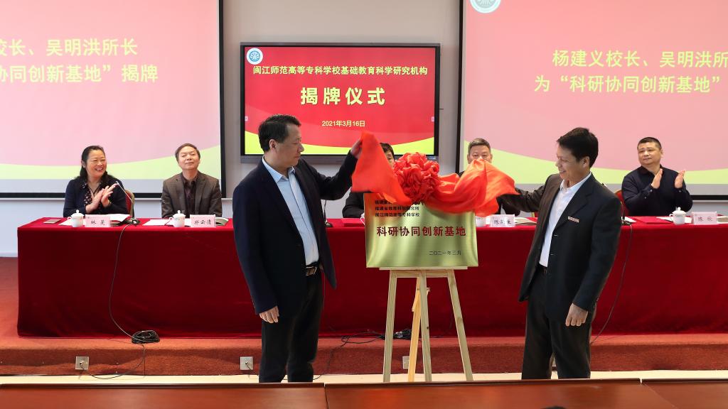 闽江师专校长杨建义、省教科所所长吴明洪为科研协同创新基地揭牌