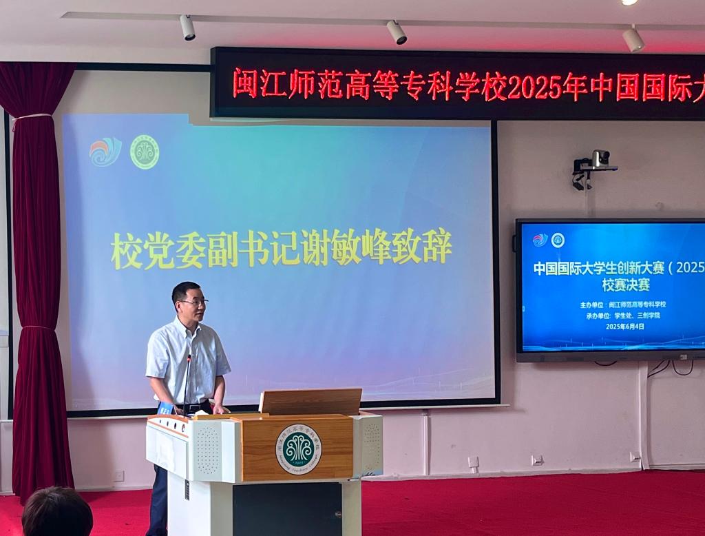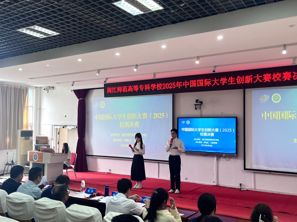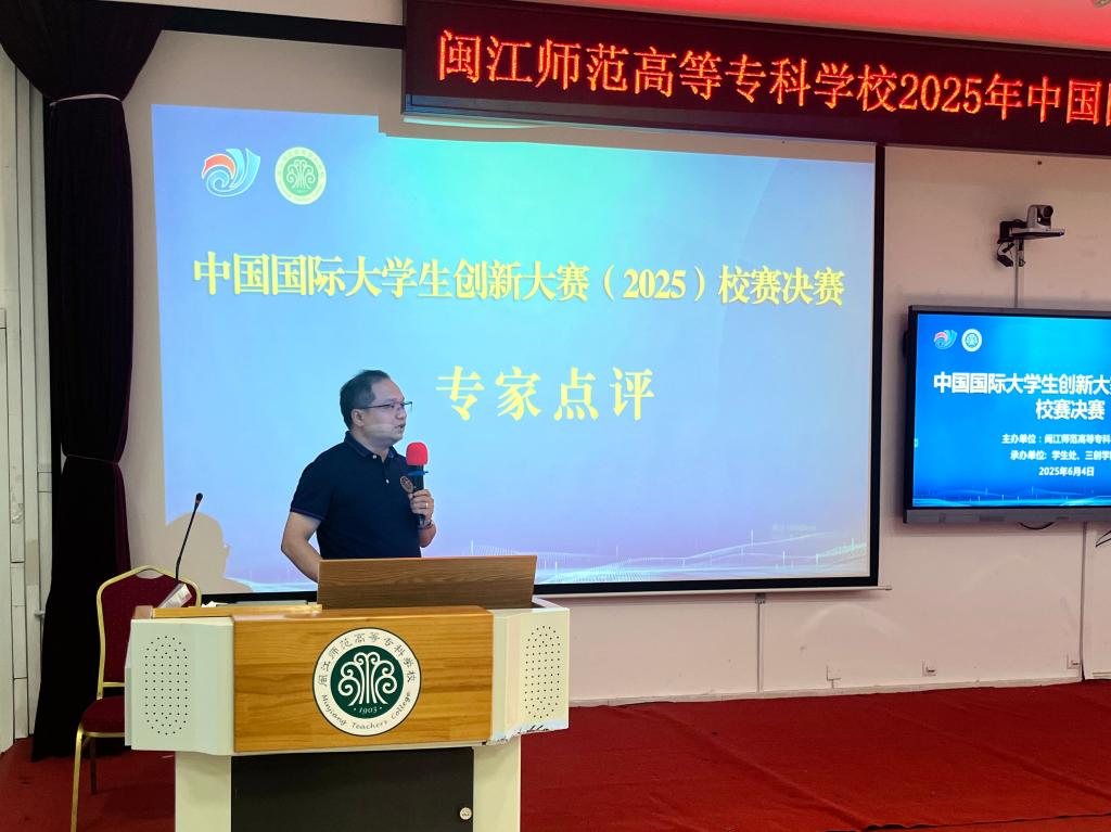 6月4日,我校在旗山校区教学楼2018阶梯教室举办中国国际大学生创新大赛校赛决赛。大赛特邀国发创新研究院院长肖平、福建拓天生物科技有限公司董事长肖志勇、福建尚才投资管理有限公司董事总经理杨志磊、福建聚优创服联合创始人林青山、福州大学生至诚学院三创中心主任吴晓敏担任大赛评审。闽江师范高等专科学校党委副书记谢敏峰、学生处相关领导、通识教育学院(三创学院)教师代表、各项目团队参赛学生、指导教师近200多人参加活动。