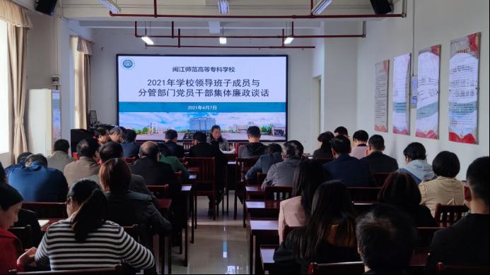 4月7日上午,林旻副校长在旗山校区八楼党员活动室主持召开集体廉政谈话会议,对办公室、教务处、科研处、基建工作小组、资产工作小组、教育科学研究所、现代教育技术中心、图书馆、工会等9个职能部门所有党员干部进行集体廉政谈话。