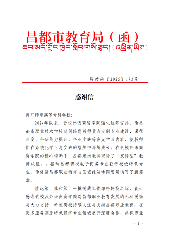 信中指出,我校积极响应国家支援西部教育发展的号召,充分发挥优质教育资源优势,为昌都教育发展注入了强劲动力。2024年以来,我校外语商贸学院强化统筹安排,为昌都市职业技术学校赴闽跟岗教师量身定制专业建设、课程开发、科研能力提升、企业实践等多元学习内容,助力昌都市职业技术学校教师综合素质提升。