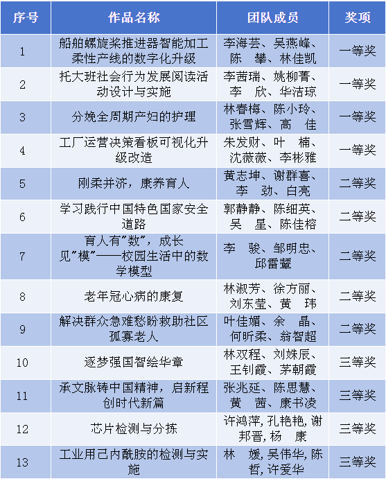 日前,福建省教育厅公布2025年福建省教学能力比赛拟获奖名单,我校教师团队共有13个项目获得奖项,其中一等奖4项,二等奖5项,三等奖4项,展现了我校教师队伍的专业素养和教学创新能力。