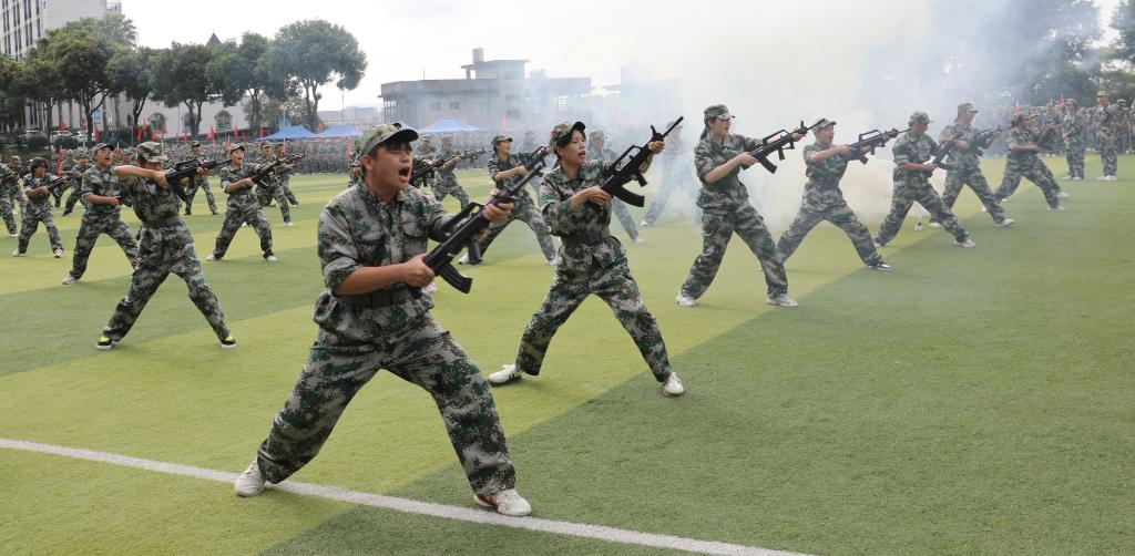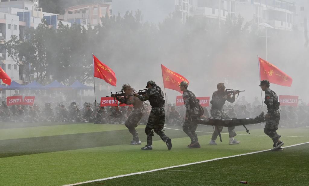 在军训会操表演中,新生队伍整齐划一、口号铿锵有力,展现出饱满的青春活力与昂扬精神。医护学院新生还结合专业特色,现场模拟战地救护等实战场景,生动展现了当代青年勇担使命、坚韧不拔的精神风貌,折射出新时代闽师学子意志坚定、奋发向上的优良品质。