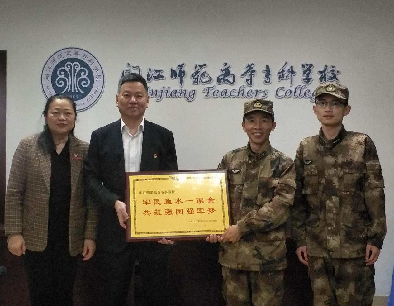 2月7日下午,解放军某部队官兵到我校赠送致谢“军民鱼水一家亲共筑强军强国梦”牌匾,受到校党委书记陈荣生、副校长林旻的热情接待。