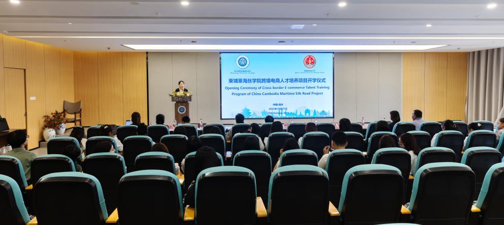 10月27日上午,柬埔寨海丝学院跨境电商人才培养项目开学仪式在我校隆重举行。我校党委书记林子波出席并致辞、副校长江柳青、学校相关部门负责人、柬埔寨金边皇家大学苏伟那教授与柬埔寨皇家大学来我校学习的学生参加。开学仪式由国际教育学院院长兰浈主持。