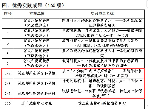 近日,由中共福建省委教育工委组织开展的“追寻领袖足迹 担当强国使命”2025年全省大学生暑期社会实践活动评选结果正式出炉。该活动由中共福建省委教育工委主办,经高校推荐、专家评审、网上公示等严格评选程序,我校人文与管理学院陈佳榕老师指导的《从“三个如何”到“万家幸福”——习近平社区治理思想在建华社区的十年实践》《积极老龄化:如何将“被动养老”转化为“价值再生产”?》2篇调研报告,马克思主义学院林双程、曾玉婷、林志香老师指导的《行走的思政课:解码教育、科技、人才“三位一体”的强国基因》视频作品荣获2025年全省大学生暑期社会实践活动“优秀实践成果”。