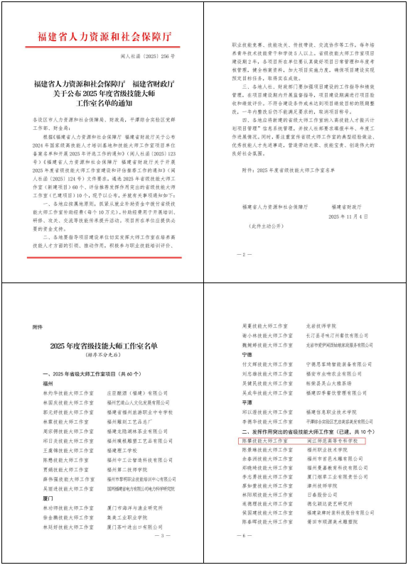 近日,福建省人力资源和社会保障厅、福建省财政厅公布2025年度省级技能大师工作室名单的通知,我校陈攀技能大师工作室凭借在技能攻关、传技带徒、交流协作等方面的卓越表现,成功入选“发挥作用突出的省级技能大师工作室(已建)”。