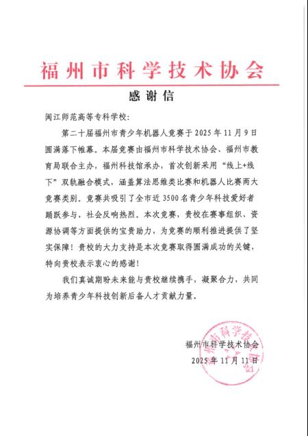 作为本次赛事的举办单位,我校组织师生志愿者深度参与竞赛组织及志愿服务工作,以专业素养和饱满热情为赛事顺利推进筑牢保障,获得主办方与参赛师生的一致好评。赛事结束后,主办方专门向我校发来感谢信,对师生志愿者的辛勤付出给予高度认可。近年来,我校始终高度重视青少年科技教育工作,此次参与赛事服务是学校支持科技实践、培育学生创新精神的重要举措。