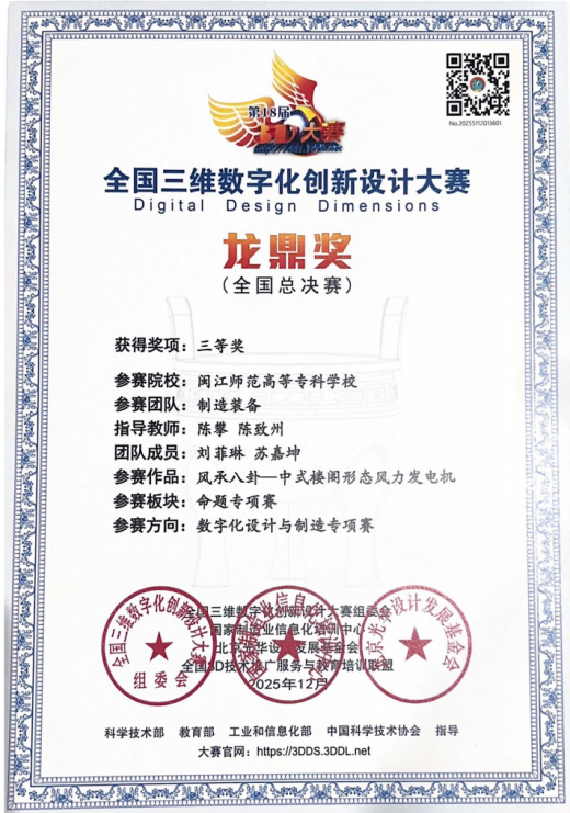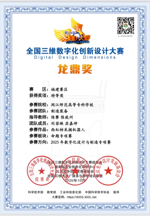 12月22日,由教育部、科技部、工业和信息化部、中国科协共同指导的第18届全国三维数字化创新设计大赛数字化设计与制造专项赛全国总决赛在北京建筑大学圆满落幕。我校智能制造学院陈攀、陈致州老师指导的刘菲琳、苏嘉坤两位学生凭借出色的表现先后在福建赛区和全国总决赛中荣获全省特等奖和全国三等奖。