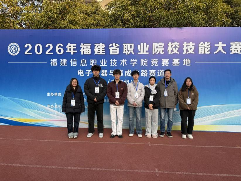 1月8日至12日,由福建省教育厅主办的2026年福建省职业院校技能大赛(高职组)“电子电器与集成电路”赛道顺利举办。由我校物联网应用技术专业教师管定铕、周原指导,学生李朋、陈智源、林雨欣、王泽华组成的参赛团队,凭借扎实的专业技能、高效的团队协作能力以及优秀的综合素养,荣获该赛道银奖。