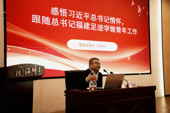 专题辅导环节,福建省团校江明磊副教授以青年发展与时代使命为切入点,围绕青年骨干的责任与成长展开授课,深入解读青年如何在理论学习中筑牢信仰之基、在实践锻炼中练就干事之才。详实的授课内容与丰富的引经据典,为全体学员带来深刻启发。