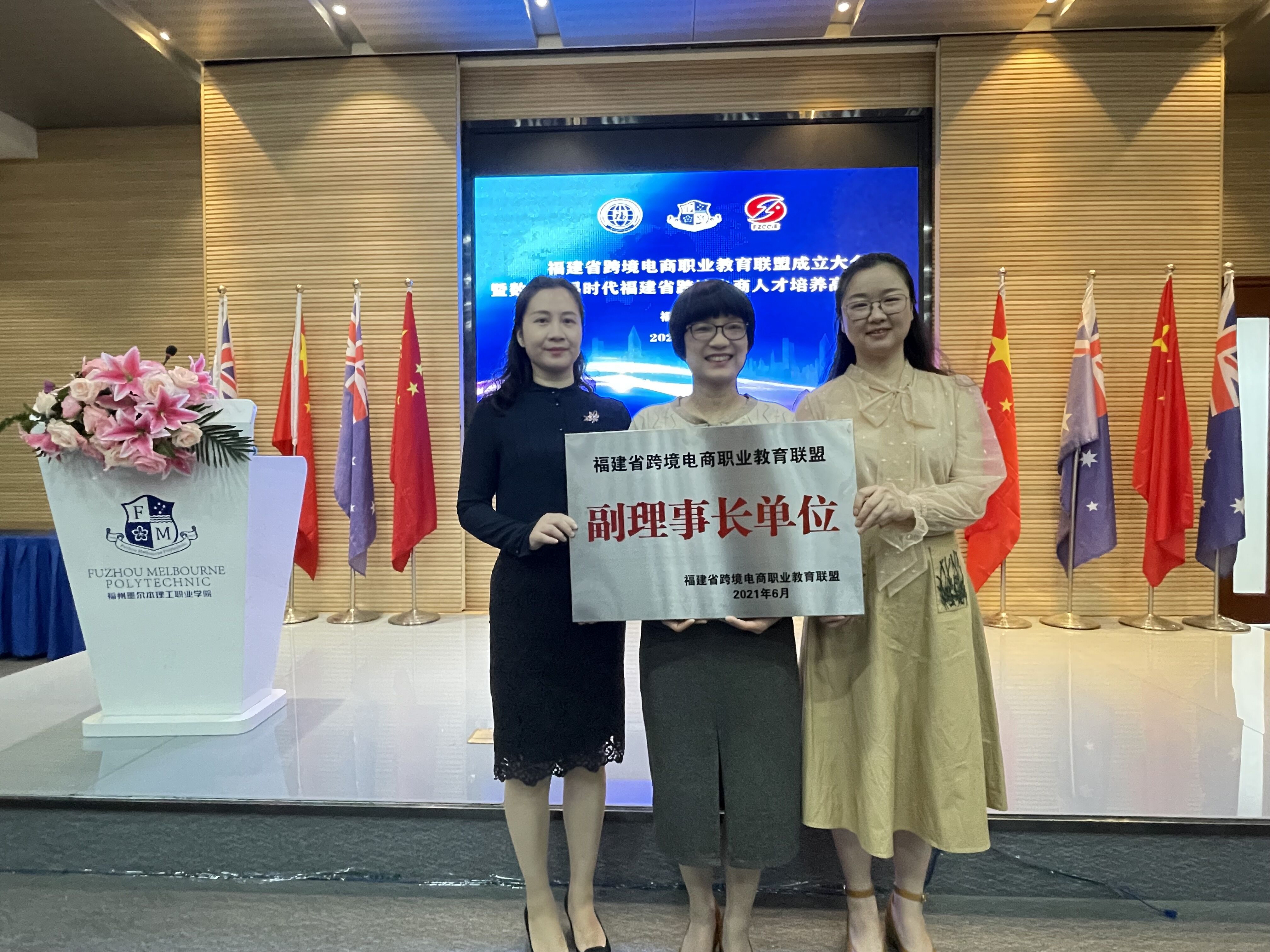 为学习宣传贯彻习近平总书记重要指示和全国职业教育大会精神,优化职业教育资源配置,加强企业与职业教育的联系,提高跨境电商职业教育质量,推动新时代跨境电商的发展,2021年6月5日福建省跨境电商职业教育联盟成立大会在福州墨尔本理工职业学院召开。省教育厅副厅长刘健、省商务厅副厅长钟木达、省贸促会副会长杨立云、原闽江职业大学校长孙芳仲及行业协会、跨境电商知名企业、学校科研机构等近60家联盟单位代表出席大会。会议公布我校成为福建省跨境电商职教联盟副理事长单位,外语系主任何少娴教授为副理事长,童敏君副教授为副秘书长、陈海燕老师为专业教学指导委员会委员。