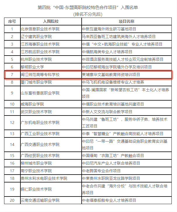 近日,中国教育国际交流协会公布了第四批“中国-东盟高职院校特色合作项目”名单,我校申报的“柬埔寨华文基础教育师资培训项目”成功入选。