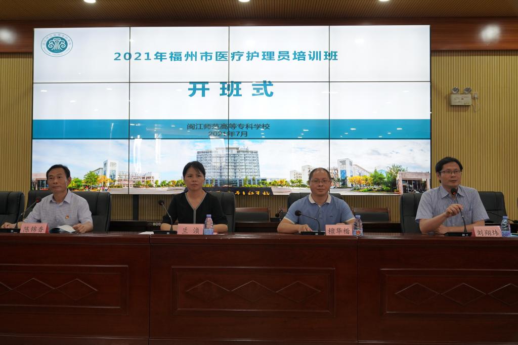 2021年7月5日上午,2021年福州市医疗护理员线下培训班(第一期)开班仪式在闽江师范高等专科学校海口校区举行。福州市卫建委医政处处长檀华楷、闽江师范高等专科学校医护学院院长刘翔炜、继续教育中心主任兰浈、医护学院副书记陈锦香、带教老师及130名学员参加了开班式。开班式由刘翔炜主持。