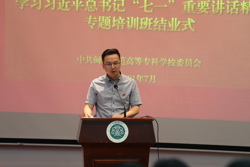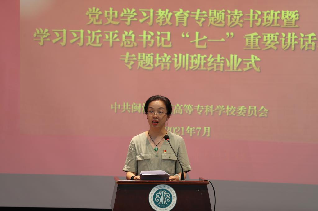 结业式上,马克思主义学院院长洪书源、学前教育系党总支书记吴春艳、艺术系党总支书记江柳青、团委副书记王海波、基建处处长黄鹤良、后勤管理处处长翁晓榕、化学与生物工程系主任陈宗保作为学员代表,围绕研讨班学习内容,结合工作实际与岗位职责讲感想、谈体会。