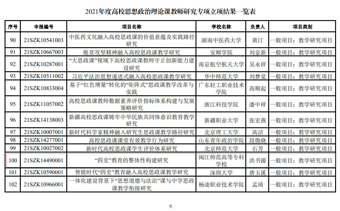 近日,在教育部社科司发布的《关于2021年度高校思想政治理论课教师研究专项》的立项通知中,我校马克思主义学院院长洪书源教授的课题《“四史”教育的整体性构建研究》喜获立项。本年度全国高校思想政治理论课教师研究专项共有169项批准立项,福建省共有8个项目获得立项,其中本科6项,高职高专院校2项。