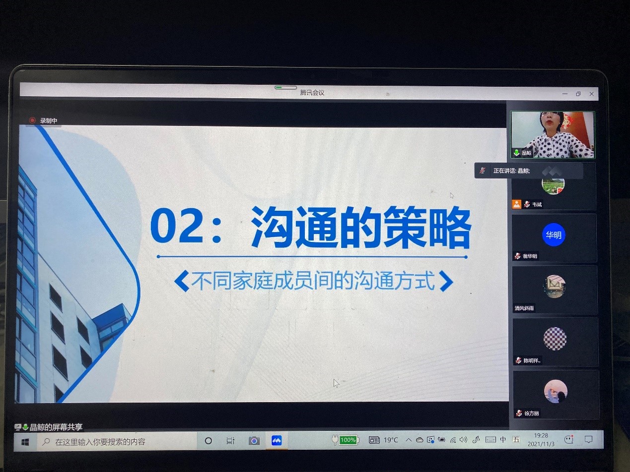 为切实推动“为师生办实事”工作,进一步加大对教职工的心理关怀,让教职工获得专业、有效、便捷的心理健康服务,11月3日晚上,校工会联合医护学院积极响应福州市总工会《关于推动落实职工温暖工程2021年心灵守护服务的通知》要求,采取“点单+精准送课”模式,邀请国家二级心理咨询师、福建团省委12355青少年服务台心理专家团成员陈晶老师作《破解家庭困扰的秘密武器--温暖的沟通》专题讲座。医护学院二级工会副主任韦斌担任视频讲座主持。