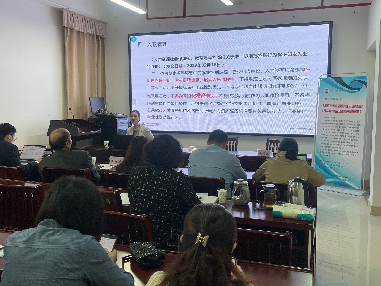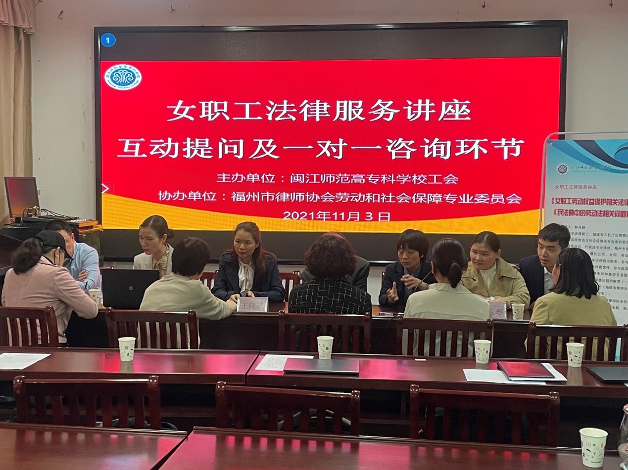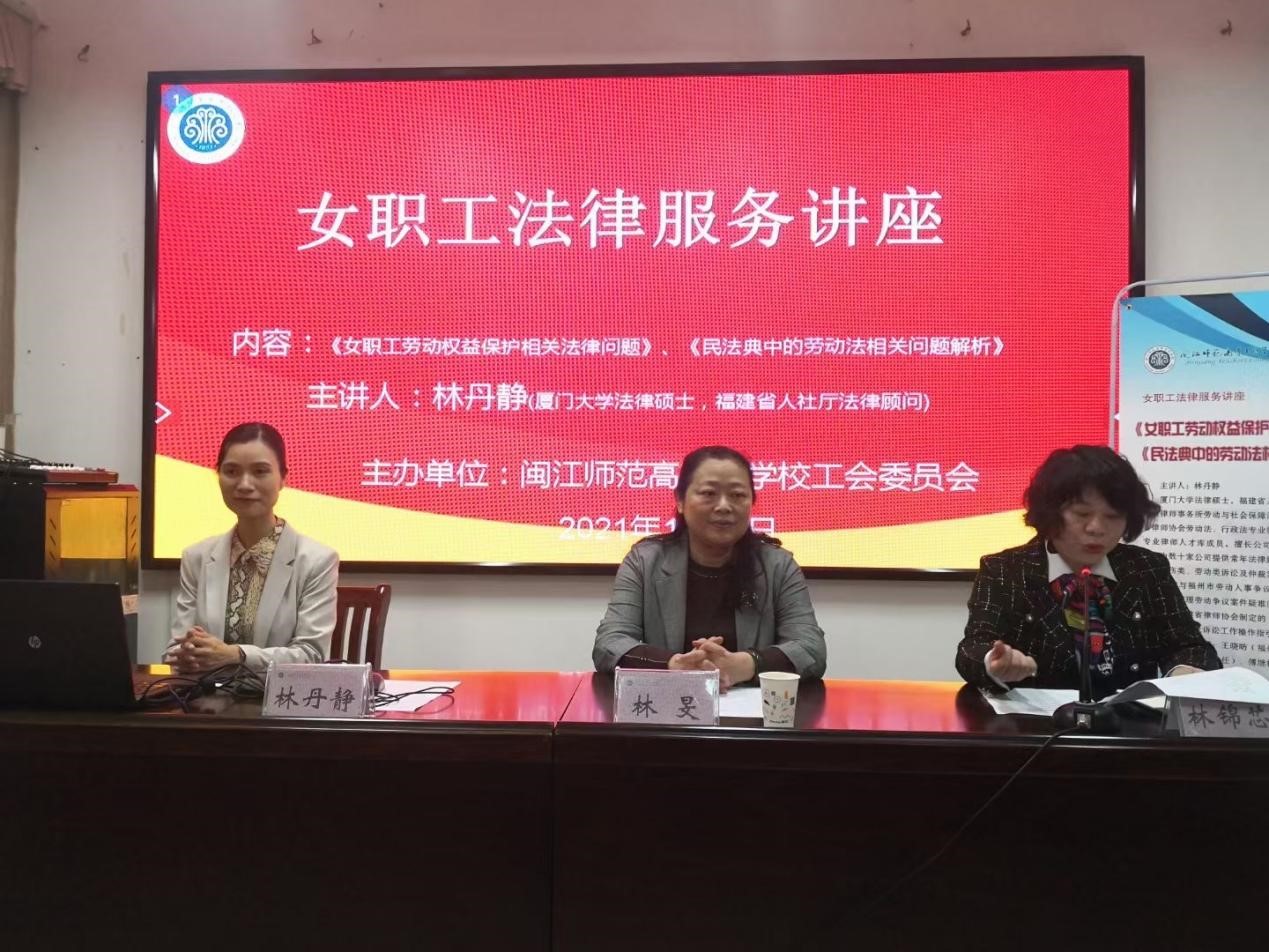为进一步推进工会法治化建设,营造和谐劳动关系氛围,充分发挥法律服务在构建和谐社会中的作用,加强女职工法律服务工作,11月3日下午,校工会、女工委积极响应福州市总工会开展“送法下基层”活动要求,采取“点单+精准送课”模式,邀请厦门大学法律硕士,福建省人社厅法律顾问林丹静律师作《女职工劳动权益保护相关法律问题》、《民法典中的劳动法相关问题解析》专题讲座。校党委委员、副校长、工会副主席林旻、女工委干部和女职工代表参加了此次讲座。讲座由校工会常务副主席、女工委主任林锦芯主持。