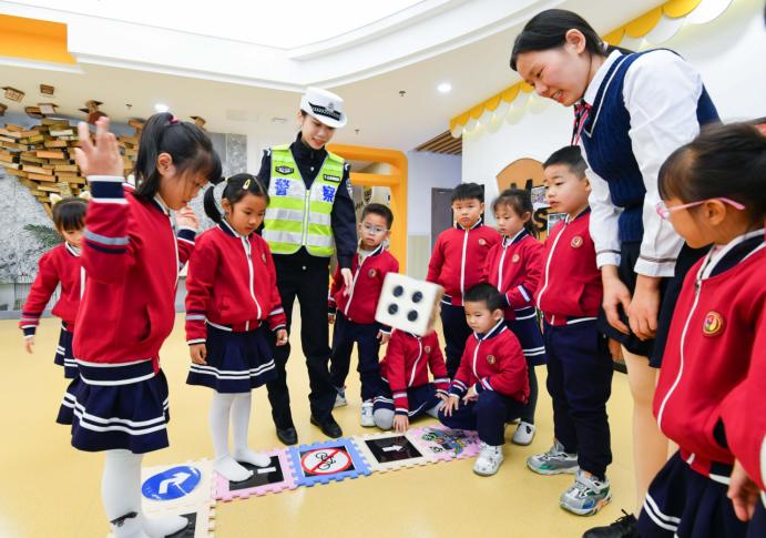 “红灯停、绿灯行、黄灯闪闪慢慢行!”“行人要走斑马线,安全才能常相伴!”“嘟嘟嘟,交警阿姨我安全到啦!”,在交通模拟游戏中,小朋友们沉浸在角色中,不时响起清脆稚嫩的呼喊,让幼儿园洋溢着欢声笑语。
