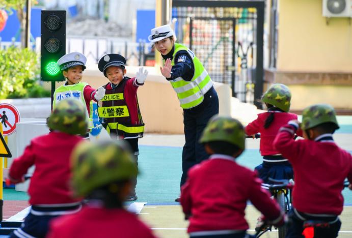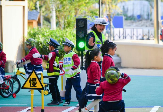 1日下午,福州市公安局交通警察支队上街(高新区)大队在闽江师专附属第三幼儿园里,开展一场交通安全出行情景模拟游戏,吸引了许多小朋友的参与。在操场上,设置了路标路牌和红绿灯装置,在交警叔叔阿姨耐心地引导下,小朋友学习体会如何安全出行。