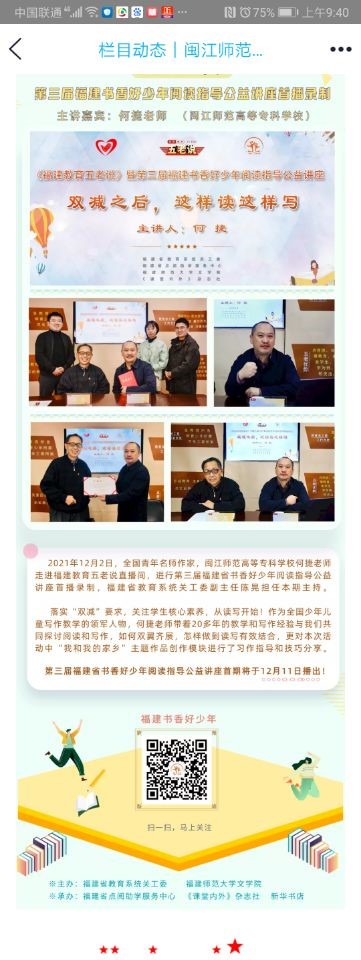 12月2日,福建教育五老说微信公众号推出了《闽江师范高等专科学校何捷老师做客福建教育五老说暨第三届书香好少年阅读指导公益讲座首播录制!》的信息,报道了全国青年名师作家,闽江师范高等专科学校何捷老师走进福建教育五老说直播间,进行第三届福建省书香好少年阅读指导公益讲座首播录制《双减之下,怎么读怎么写!》的主题讲座情况。落实“双减”要求,关注学生核心素养,从读写开始!作为全国少年儿童写作教学的领军人物,何捷老师带着近30年的教学和写作经验与大家共同探讨阅读和写作,如何双翼齐展,怎样做到读写有效结合,更对本次活动中“我和我的家乡”主题作品创作模块进行了习作指导和技巧分享。