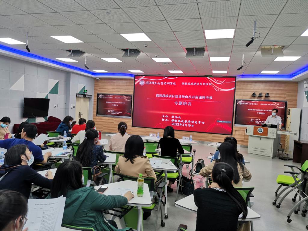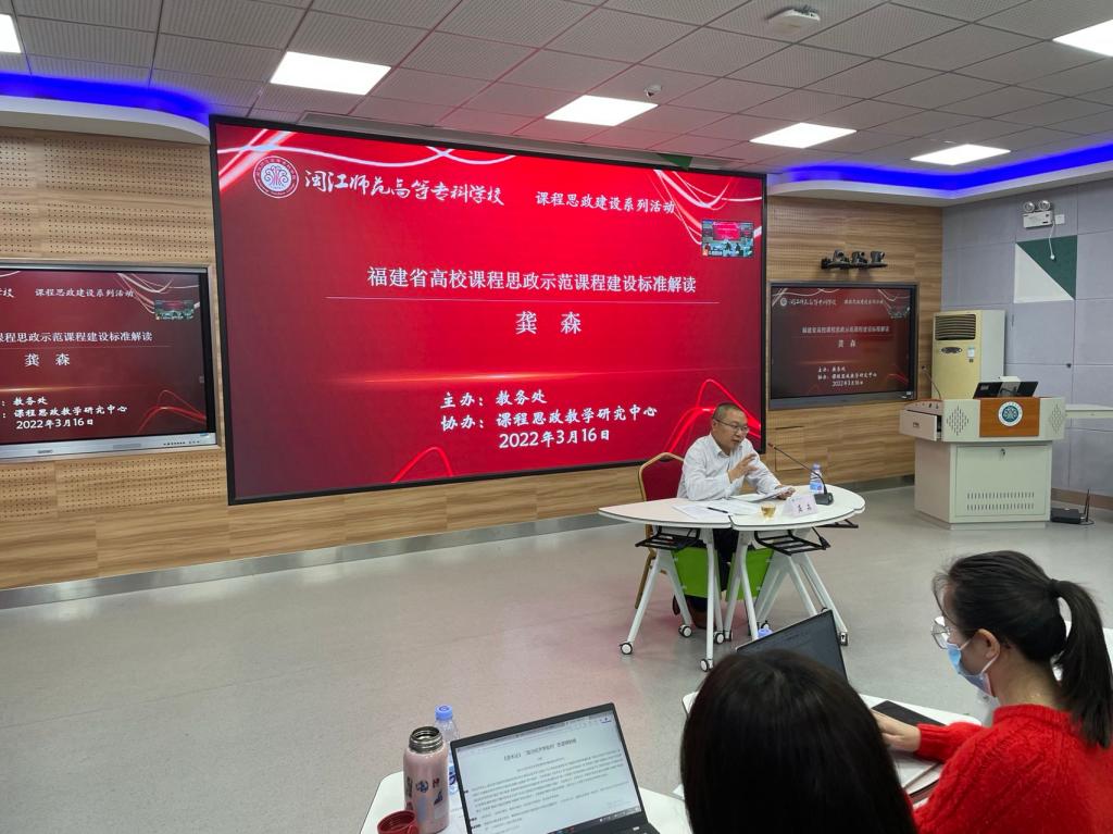 为进一步落实立德树人根本任务,充分发挥教师主力军、课堂教学主战场、课程思政主渠道作用,深入挖掘专业课程育人功能,营造“课程门门有思政,教师人人讲育人”的生动氛围。3月16日下午,教务处与课程思政教学研究中心联合召开课程思政项目建设指南及示范课程申报专题培训,邀请了福建省职业技术教育中心主任龚森和陕西工业职业技术学院梁晓哲教授为我校教师开展培训。本次培训采取线上+线下模式,副校长林旻、教务处处长葛思华、拟申报课程思政示范课程的负责人及马克思主义学院老师参加培训。