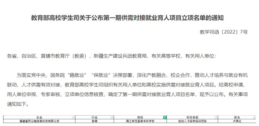 近日,教育部高校学生司公布了第一期供需对接就业育人项目立项名单(教学司函〔2022〕7号),我校外语商贸学院联合校企合作企业福建富民云咖信息科技有限公司共同申报获批第一期供需对接就业育人项目立项。