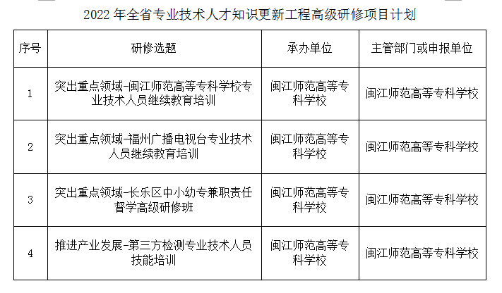 近日,福建省人力资源和社会保障厅办公室公布了《关于做好专业技术人才知识更新工程2022年高级研修项目实施工作的通知》(闽人社办〔2022〕50号)。根据该《通知》,2022年全省专业技术人才知识更新工程高级研修项目计划共89期,其中国家级高级研修项目2期,省级项目87期。我校申报的《长乐区中小幼专兼职责任督学高级研修班》等4个项目获批省级项目。