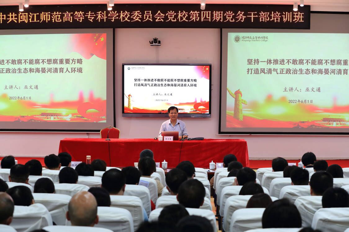 为进一步加强基层党组织建设,提升我校党务干部的党性修养、业务能力,进一步筑牢拒腐防变的思想防线,6月1日下午,学校特别邀请省教育纪工委原书记巫文通于旗山校区2018教室作《坚持一体推进不敢腐不能腐不想腐重要方略,打造风清气正政治生态和海晏河清育人环境》专题辅导讲座。校党委书记陈荣生、校长杨建义、副校长林旻、副校长谢敏峰、纪委书记陈群,各部门、学院、单位负责人,二级党组织书记、委员,下属党支部书记、纪检委员参加讲座。讲座由陈群主持。