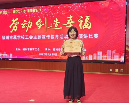 近日,由福州市教育工会主办的市直属学校工会“劳动创造幸福”主题宣传教育活动教师演讲比赛决赛在福州格致中学鼓山校区举行,共有58所学校代表选手参与角逐,我校代表选手医护学院青年教师徐方丽获得演讲比赛三等奖。